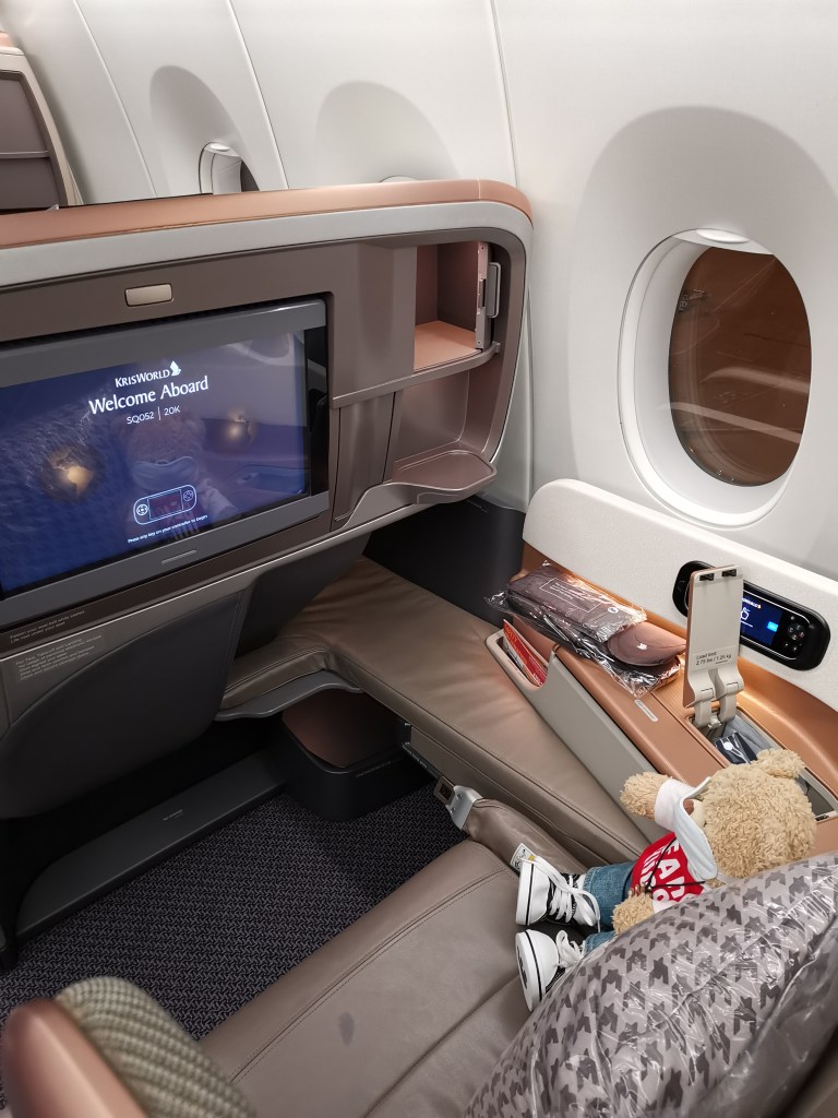 I was boarded pretty quickly and had a separate entrance to the people in Economy.  Once inside, I could see that this plane was a step up from the business class for the Adelaide to Singapore flight.  The seating pods are as big as 2 economy seats and they have a fold-down bed, complete with linen.