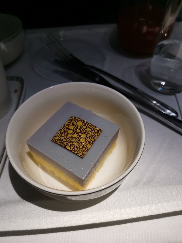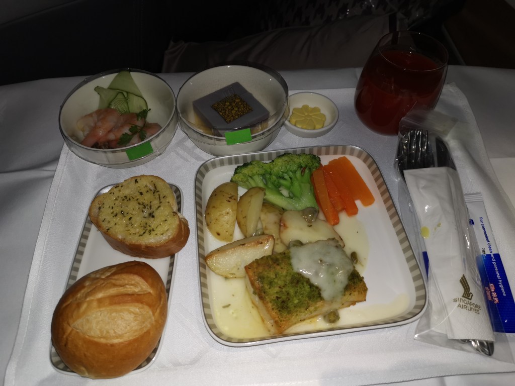 Supper came about pretty quickly and for airline food, it was very nicely presented and my crusted fish was nicely cooked.  The white table cloth was placed over my tray table and again I had proper crockery and cutlery. The fish was accompanied by julienne carrots, broccoli and potatoes with a white sauce on it.  There was a slice of garlic bread and a warm bread roll.  For entrée was a small prawn cocktail with a very thin slice of cucumber, some Edamame (soy beans) and red quinoa.  The dessert was a lemon butter cate with lavender cream.  Very nice.