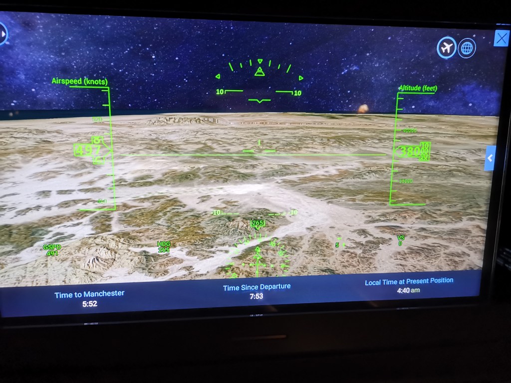 I sat up for a while with the map slowly scrolling through the journey.  The 3D map had a setting so you can see where you are going, where you are, the view from above and the view as if from the front of the plane.  It is a shame that it doesn’t have the real view.