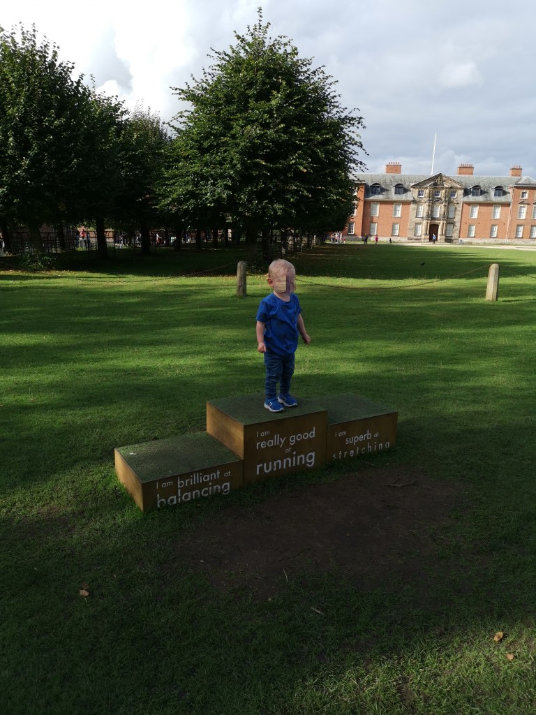 Our little champion (blurred on purpose) with Dunham Massey in the background