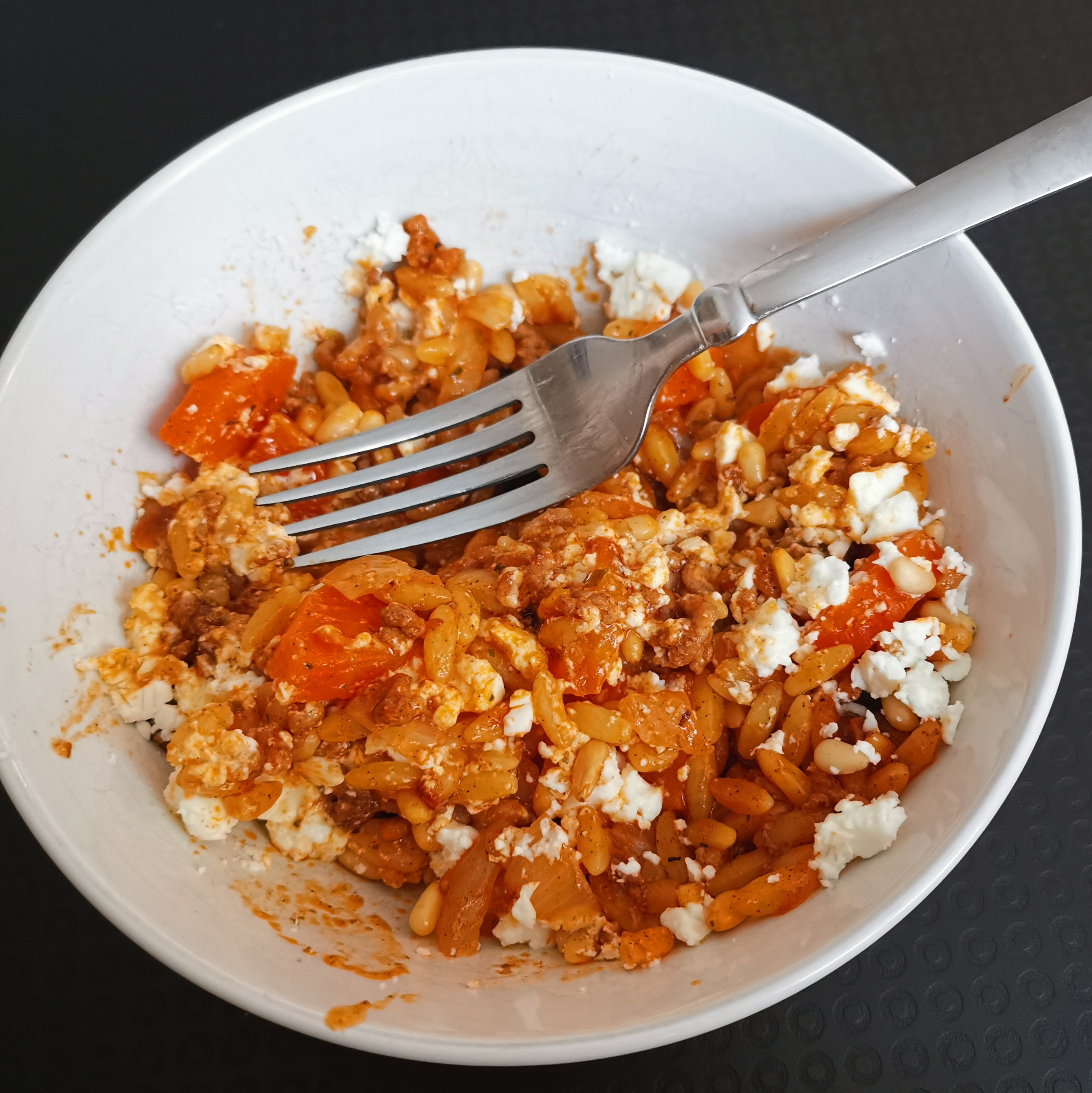 I had never heard of Orzo or Risoni pasta before. It is a wheat pasta that looks very much like rice. The body of the meal is a lovely mix of lamb mince, tomato sauce, carrot, herbs and topped with feta cheese. It smells amazing when it is cooking and tastes really nice. I think even John would like it, although he might have passed on the crumbled feta cheese.